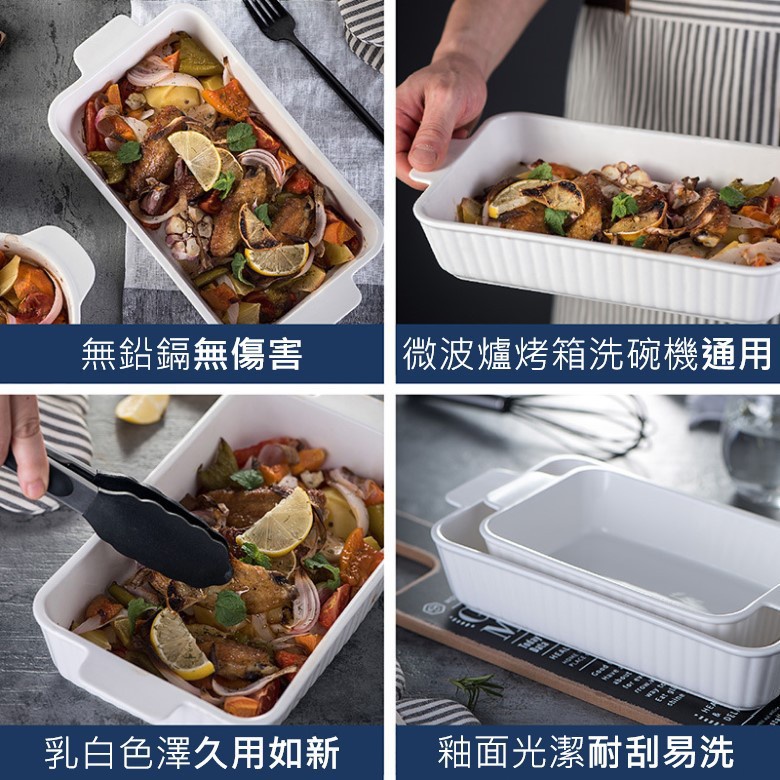 純白陶瓷條紋雙耳烤盤-方形 (大號11.5吋)